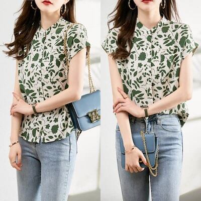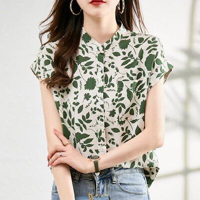 ブラウス レディース トップス 半袖 フレンチスリーブ 柄 グリーン 薄手 スタンドカラー さわやか おしゃれ