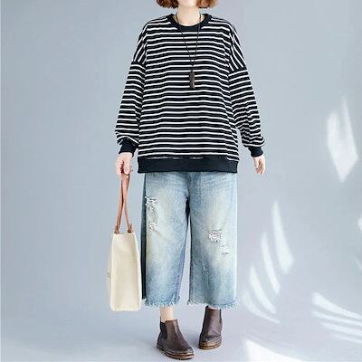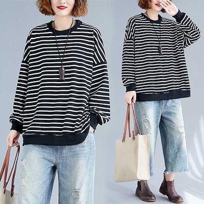 スウェット プルオーバー レディース トップス カットソー スエット トレーナー ボーダー 丸首 長袖 長そで 大きいサイズ ゆったり 綿混 コットン混 秋 スウェットプルオーバー