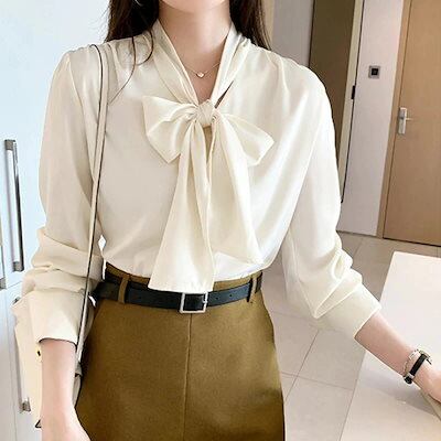 ブラウス ボウタイ りぼん レディース 長袖 シャツ リボンタイ シフォンブラウス パフスリーブ トップス オフィス カジュアル きれいめ 大人 無地 フォーマル 春 秋 冬 韓国 韓国ファッシ