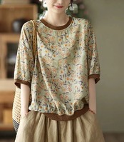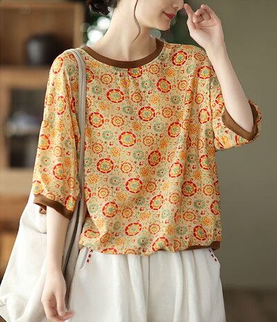 Tシャツ ブラウス レディース シャツ ガーゼ チュニック 綿麻 半袖 切り替え 前開き アウター シャツ ゆったり トップス 可愛い 花柄 大人 デート 通勤 オフィス カジュアル シンプル オシャ