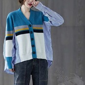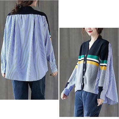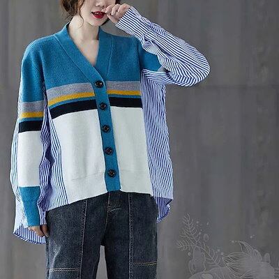 ストライプ切り替えニットカーディガン ニット カーディガン レディース カーデ 羽織り シャツ ゆるニット ドロップショルダー 無地 ストライプ 切り替え 長袖 アンバランスヘム ドルマンスリーブ