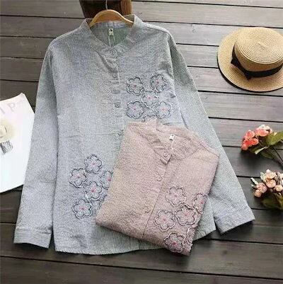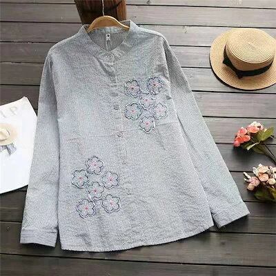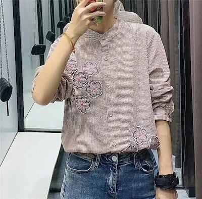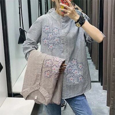 刺繍 シャツブラウス レディース 花柄 シャツ ブラウス 長袖 トップス 秋 バンドカラー カジュアルトップス ナチュラル 通勤 着回し コットン 柔らかい 可愛い ストライプ 羽織り