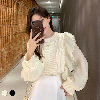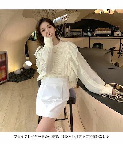 セーター レディース ニットセーター シャツ フェイクレイヤード フレアニット セーター 秋冬 クルーネック 綿混紡 ゆったり トップス 長袖 秋 カジュアル お洒落