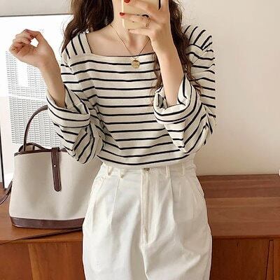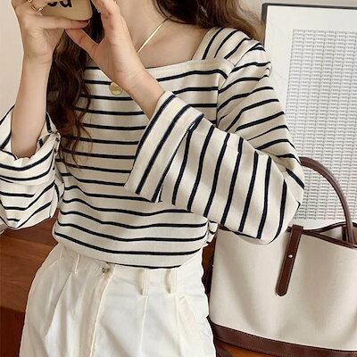 ボーダー Tシャツ レディース カットソー トップス スクエアネック 長袖 コットン レイヤード 重ね着 無地 柔らかい 通学 通勤 カジュアル 春 秋 シンプル