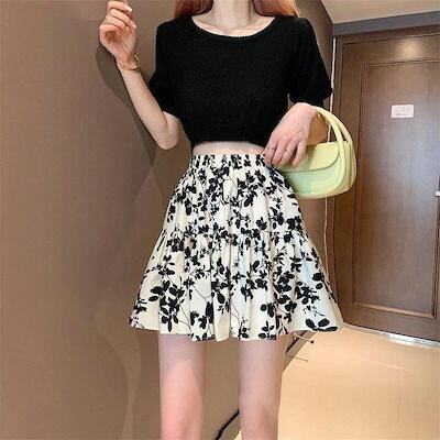 脚魅せミニスカート ショートスカート 大きいサイズ花柄スカートシフォンバッスルアンチグロスパンツスカート夏女性ハイウエストスモールウエストゴムスカート 韓国ファッション