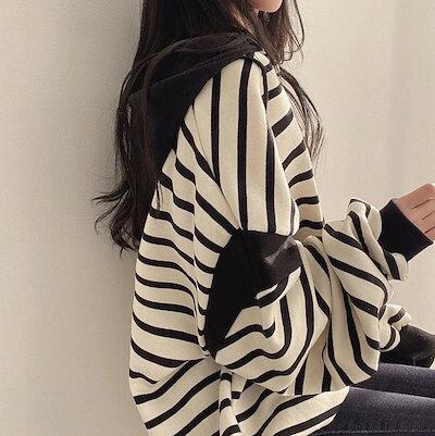 パーカー ゆったりスウェット 2025新作 シンプル 運動 裏起毛 ボーダー柄 百掛け スウエットトップス アウター 可愛い ロング着痩せ 大きめサイズ 長袖 韓国ファッション