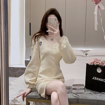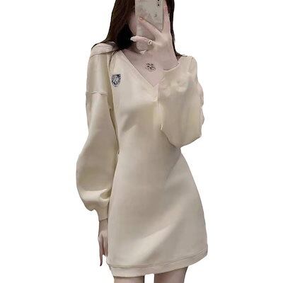 パーティードレス ワンピース 韓国ファッション 女性のためのシンプルで甘いvネックトレーナードレスカジュアルファッション秋冬デイスタイル長袖学生スカート