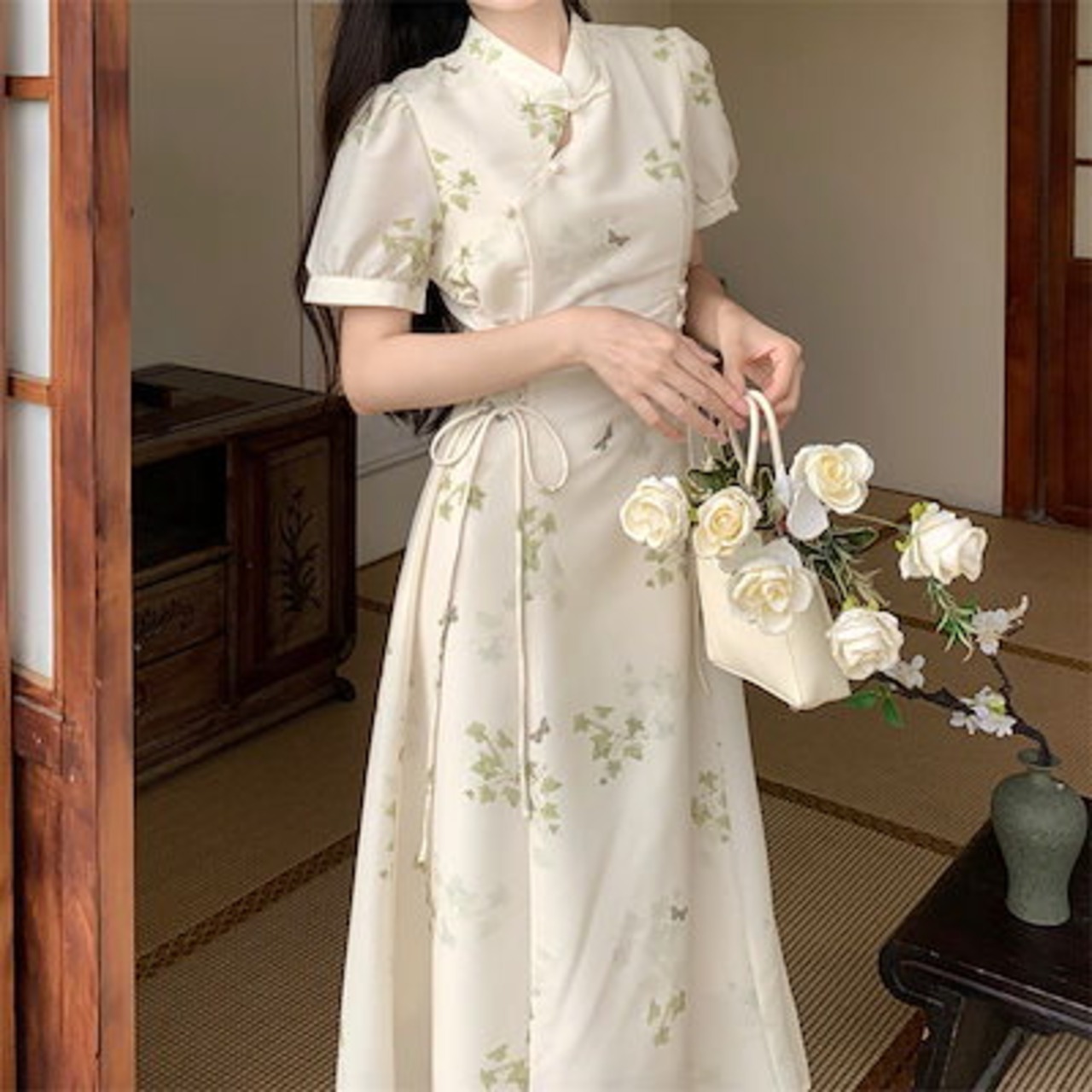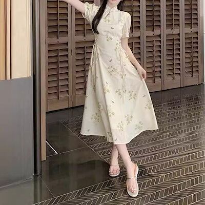 パーティードレス ドレス ワンピース 改良チャイナドレス 韓国ファッション レトロディスクバックルドレス女性夏大きいサイズ改良されたチョンサンウエストタイロングスカート