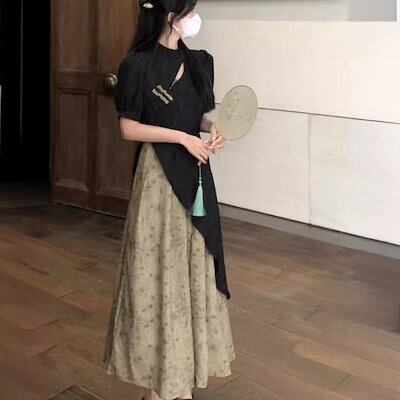 パーティードレス ドレス ワンピース 改良チャイナドレス 韓国ファッション 修正チョンサム2024夏の新しい薄い気質偽のツーピースロングスカート