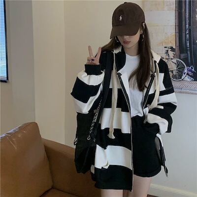 マウンテンパーカー 初秋 ストライプ ドローストリング 長袖 セミロング丈 スウェット パーカー ダウンジャケット 冬アウタージャケットジャケット裏起毛厚手韓国ファッションプス フード付き パ一カ一