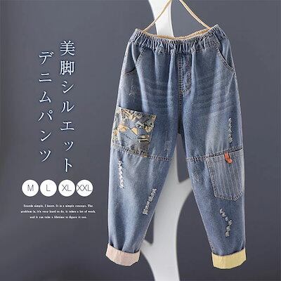 デニムパンツ レディース 大きいサイズ テーパードパンツ ボトムス チノパン ジーパン ロールアップ 森ガール 春 無地 ズボン ウエストゴム 大きいサイズ 柔らかい ゆったり 体型カバー オシャレ