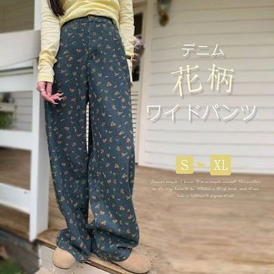 デニムワイドパンツ デニムパンツ レディース 花柄 ジーンズ 総柄 ストレートパンツ ボトムス ワイド パンツ 大きいサイズ ゆったり バギー 春夏秋 カジュアル ズボン 美脚 柔らかいデニム ゆった