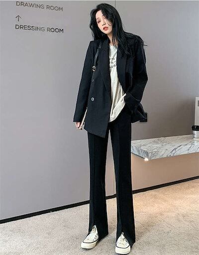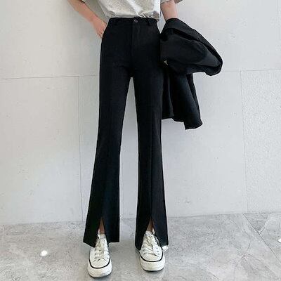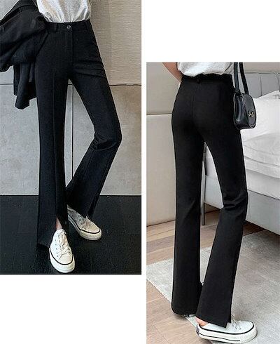 ロングパンツ レディース スリットパンツ 春 秋 秋 無地 スリット パンツ きれいめ ストレッチパンツ 9分丈 ロング丈 ボトムス ズボン フレア スラックス 黒パンツ フロントスリット おしゃれ