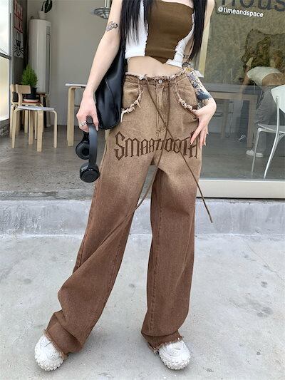 デニムパンツ ジーンズ アメリカン レトロ ローエッジ ストレート ジーンズ レディース 夏 痩身 モップ デザイン ズボン 個性 ワイドレッグ パンツ トレンド