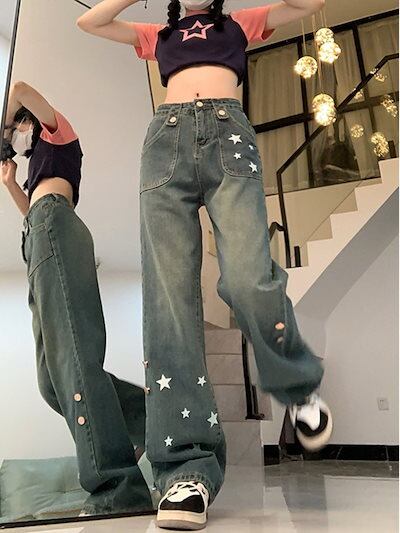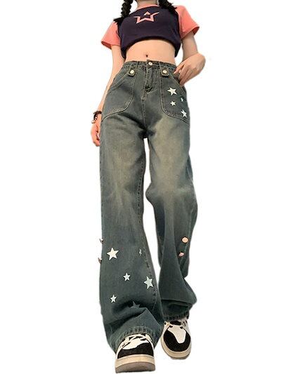 ハイストリートジーンズ ヴィンテージ スター デザイン ジーンズ レディース 大きいサイズ 秋冬 ハイストリート ハイウエスト 薄手 ストレート ワイドパンツ ?国ファッション