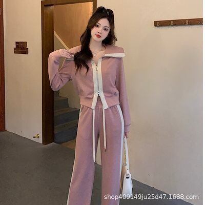 セットアップ カジュアルスポーツスーツレディース春ドールカラーセーターハイウエストストレートパンツ2点セット