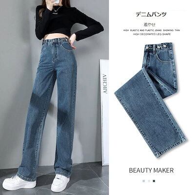 ハイウェストパンツワイドジーンズズボンストレートウエストゴムパンツレディースゆったりダメージW
