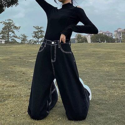 韓国ファッション デニムパンツ ブラックギャザーストレートジーンズレディース秋冬新作韓国版ハイウエストで細く見えるゆったりとしたワイドなドレープ感のモップパンツ