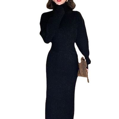 ワンピース 2024秋冬新作ウエスト痩せ見え上品セータースカートロングタートルネックニットワンピース女