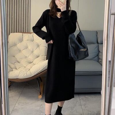 ワンピース Vネックニットワンピース2024秋冬新作おしゃれファースカート