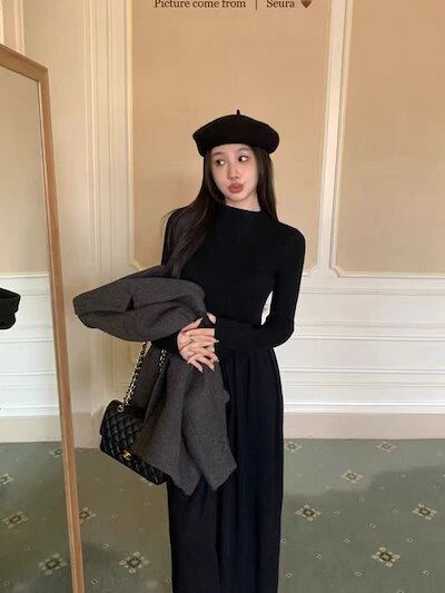 ワンピース ハーフハイネックニットワンピースレディース2024秋冬新作ピュアカラーキルティングファッションウエストダウンボトムスカート