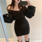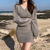 ワンピース 韓国の優しい風ニットワンピース2024秋の新作Vネッククロスヒップファースカート