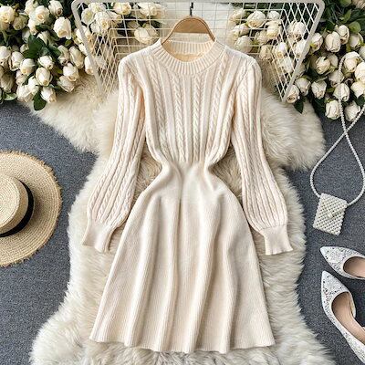 ワンピース 2024秋冬新作ハンディーウエスト編み長袖セーターワンピース
