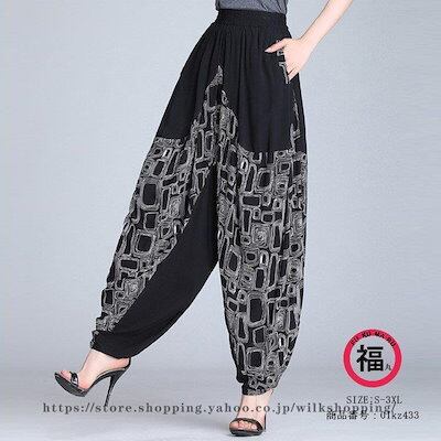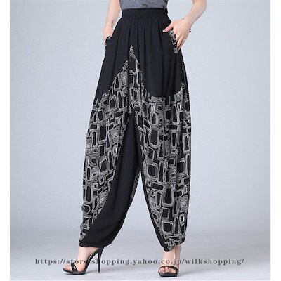 パンツ ロングパンツ バルーンパンツ スカンツ スカーチョ ボトムス レディース ズボン 幾何柄 ハイウエスト ウエストゴム 美脚 ポケット付き 着痩せ 春 秋 50代