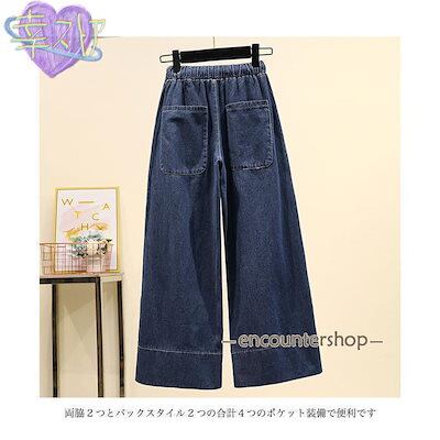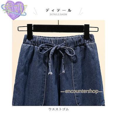 デニムパンツ レディース ワイドパンツ 無地 九分丈 紐付き ポケット付き ウエストゴム 柔らかい ゆったり 美脚 春夏秋 お出かけ