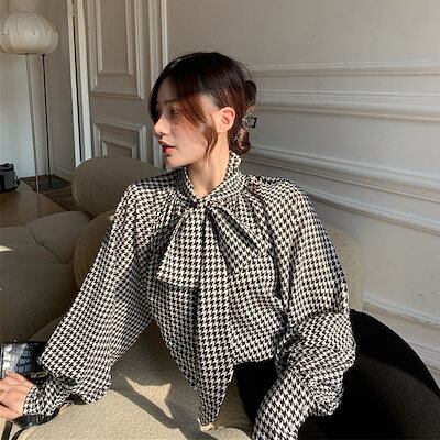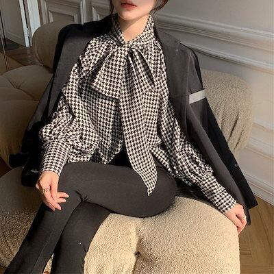 韓国 ブラウス チェック デザイン リボン 長袖 シフォンブラウス シアーシャツ トップス シャツ 体型カバー 大きいサイズ ロングシャツ シースルーシャツ レディース