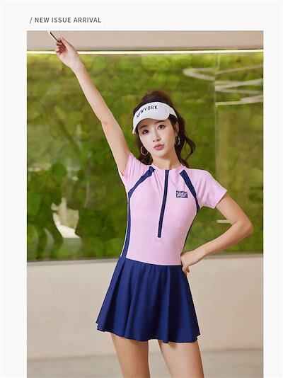 水着 レディース ワンピース 体型カバー 大きいサイズ かわいい おしゃれ 無地 フィットネス 半袖 ハイウエスト 露出控えめ スポーツウェア スカート オールインワン ママ水着 オトナ女子 フィット
