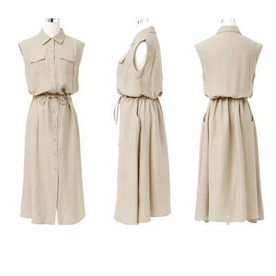 夏 ノースリーブワンピース ウエストロープ付き レディース 無地 綿麻 ワンピース 度假 夏ワンピ 通勤 ポケット飾り 開襟ロング丈 ワンピース