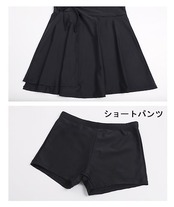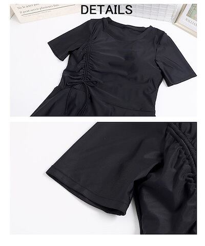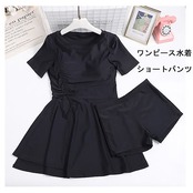 水着 レディース ワンピース水着 セットアップ ショートパンツ ぽっちゃり 袖あり 半袖 露出控えめ 体型カバー お腹カバー お尻カバー 2点セット ブラック 無地 シンプル 可愛い フレアスカート