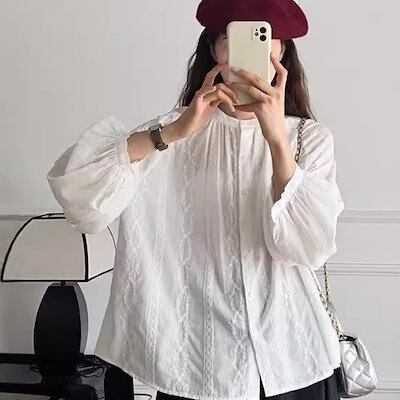 2025 春夏 シャツ ラウンドネック 長袖 ブラウス レディース トップス 韓国ファッション