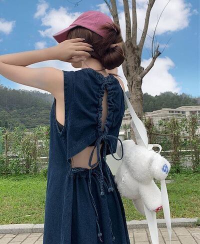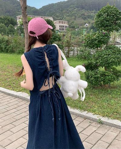 新作 夏 デニムワンピース ノースリーブワンピース ワンピース 美背 ドローストリング ウエスト引き締め 流行り 百掛け 個性デザイン 韓国ファッション ゆったり 着やせ