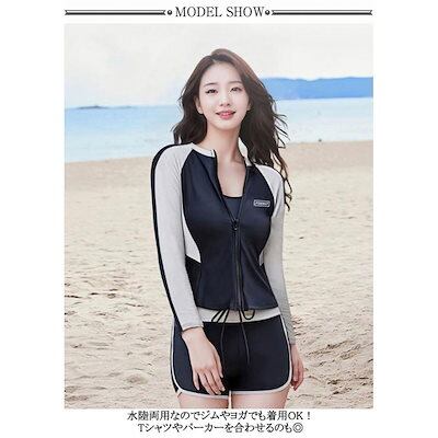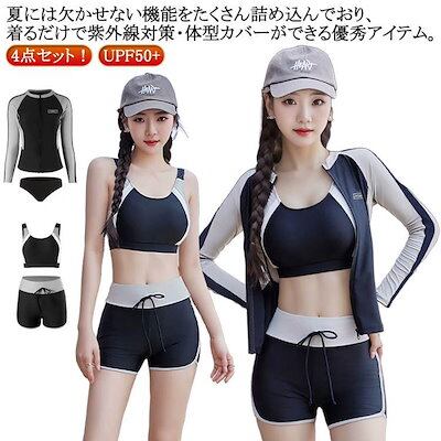 体型カバー 日焼け防止 水着 レディース水着 レディース 長袖ラッシュガードセット UPF50 レディース水着 フィットネス水着 4点上下セット か