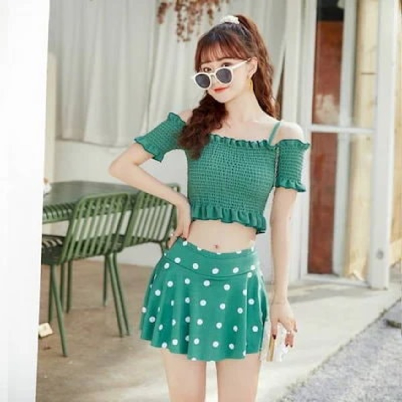 韓国 水着 レディース オフショルダー 体型カバー リゾート ビーチ 水着 ワンピース 2点セット セクシー バックシャン 学生 Y52