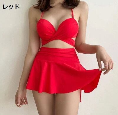 激安水着ビキニ レディース 水着 3点セット スカート付き ホルターネック スイムウェア ビーチウェア クロスデザイン バックリボン カジュアル