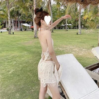 水着レディース体型カバービキニ3点セットVネック羽織りラッシュガード体型カバー水着セットアップショートパンツ上下セット203040ミセスセクシーママ女性用長袖透け流行かわいいカバー女の子スイムウェア