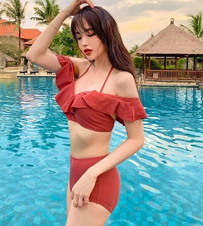 水着 ビキニ スイムウェア レディース 体型カバー セパレート オフショル パッド付き 二の腕カバー フリル セット ツーピース 上下セット 大人可愛い きれいめ シンプル ナチュラル 大人っぽい