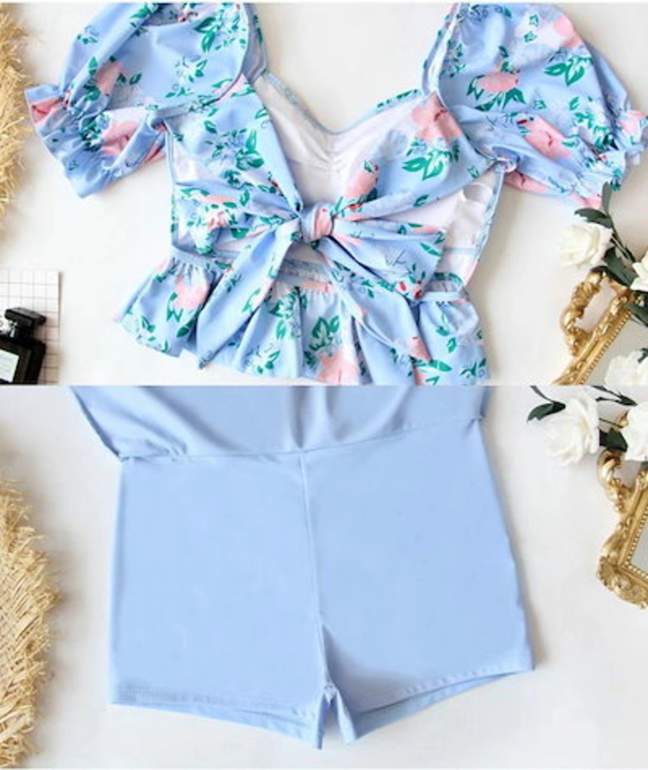【急速出荷!】再入荷商品レディース 水着 セパレート ビキニ セットアップ 花柄 フリル リボン おしゃれ みずぎ トップス ノンワイヤー スカート ショーツ付き ブルー 日焼け止め 露出控えめ ビー