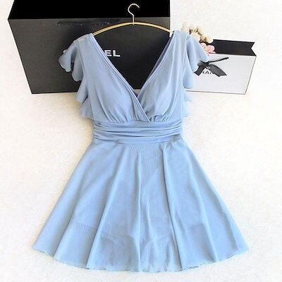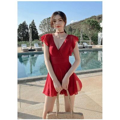 [限定購入/新品/出荷が早い]ワンピース 水着 シースルー Vネック パッド入り ワイヤーあり ビーチ スイムドレス シアー ウエストマーク フリル スカート レディース