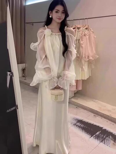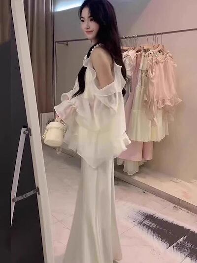 2025 年夏新作 フレンチスタイル フリルハンガーネック シフォンロングスリーブ レディース スリムデザイン ミディスカート ツーピース トレンド
