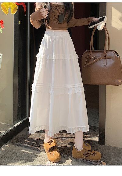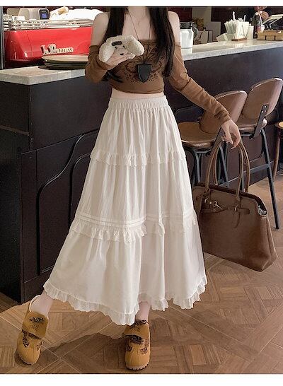 2025春夏 韓国スカート ミディアム丈 Aライン ハイウエスト 美脚効果 脚長効果 細見え おしゃれ かわいい 甘め フェイクキュートフレンチ 韓国系ファッション レディース お出かけ