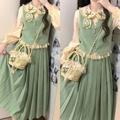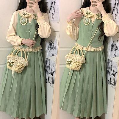 【フルセット】チューリップ新韓国人形襟シャツベスト百フリルスカートセット森系レディース