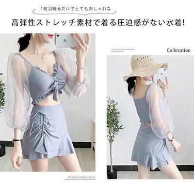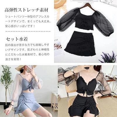 【急速出荷!】コストパフォーマンス水着 レディース 体型カバー 3点セット 透け感 長袖 タンキニ フリル スリーブ 紫外線対策 ハイウエスト ショートパンツ アフレスカート 上下セット 韓国 温泉