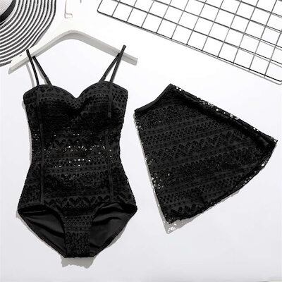 【急速出荷!】期間 水着 レディース 体型カバー 2点セット ワンピース水着 オールインワン ママ水着 フリル 大きいサイズ スカート 細見え ぽっちゃり ブラック 可愛い セクシー かわいい レース