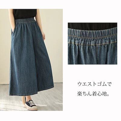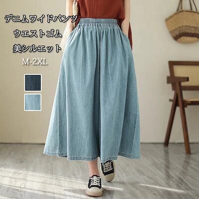 再入荷品デニムパンツ ワイドパンツ レディース デニム パンツ ウエストゴム ロング丈 無地 ガウチョパンツ タック ポケット付き ボトムス 体型カバー スカーチョ ゆったり ロングパンツ フレア カ