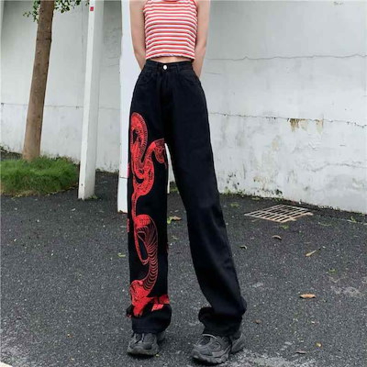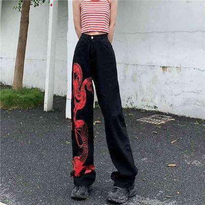 新品更新 デニムパンツ ヘビ 蛇 黒 ジーンズ ワイド 個性的 ジーパン 韓国系 かっこいい デニム ズボン レディース ストレート ブラックデニム 赤 へび 蛇デザイン バイカラー ボトムス ハイウ