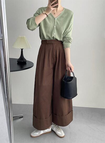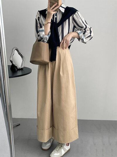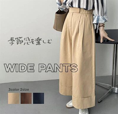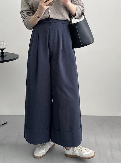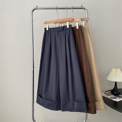 お値下げしましたワイドパンツ レディース ハイウエスト 春秋冬 バックゴム ポケット付き 綿100% ボトムス ロングパンツ 裾折り返し ゆったり ガウチョパンツ かわいい おしゃれ きれいめ 上品